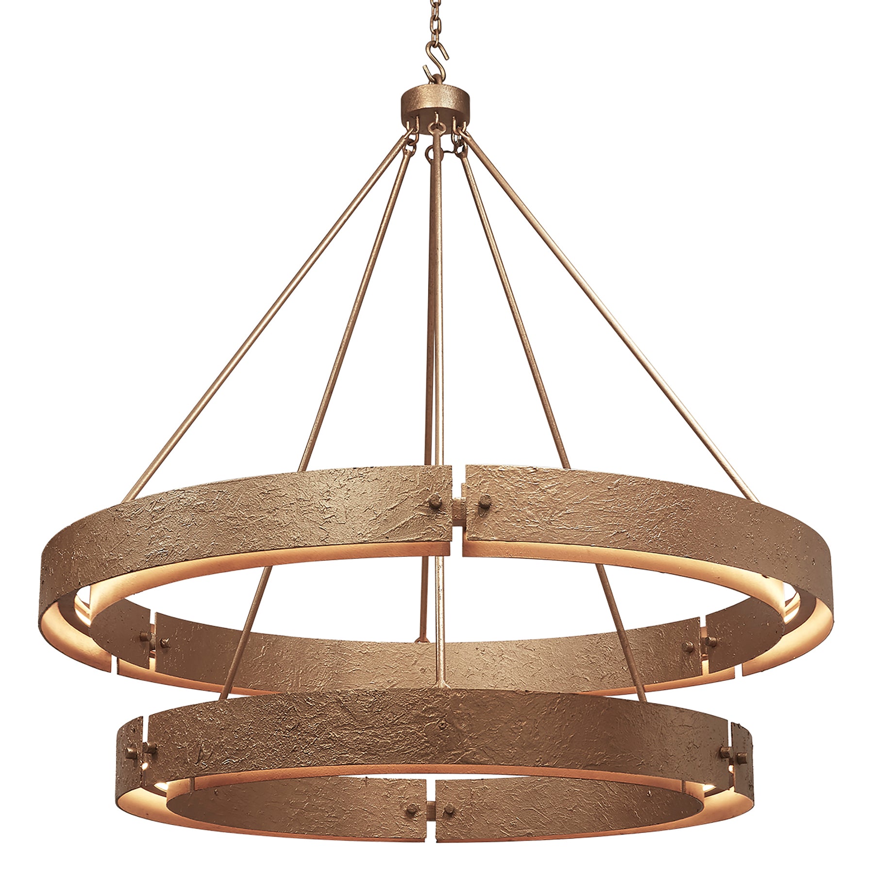 The 2 Tier Darlana is a handcrafted wrought iron chandelier featuring a sculptural double-ring design and modern circular illumination.
